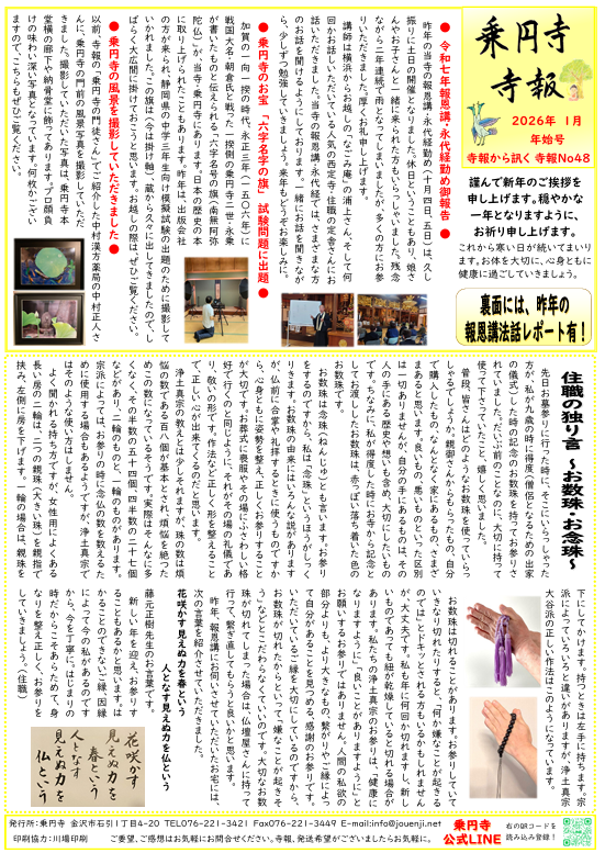 当寺は昔、天台宗に属していましたが、当時の住職が蓮如上人の教えを受け、浄土真宗寺院となりました。寺の歴史を見つめてみると、民衆・門徒と共に生き、苦難を乗り越えてきた寺と言えます。幾度となく寺が燃えましたが、多くのご協力により再建してきました。この歴史・場を守りながら、今を生きる方が心傾けられる寺として、「共に生きる寺」としてあり続けたいと考えています。